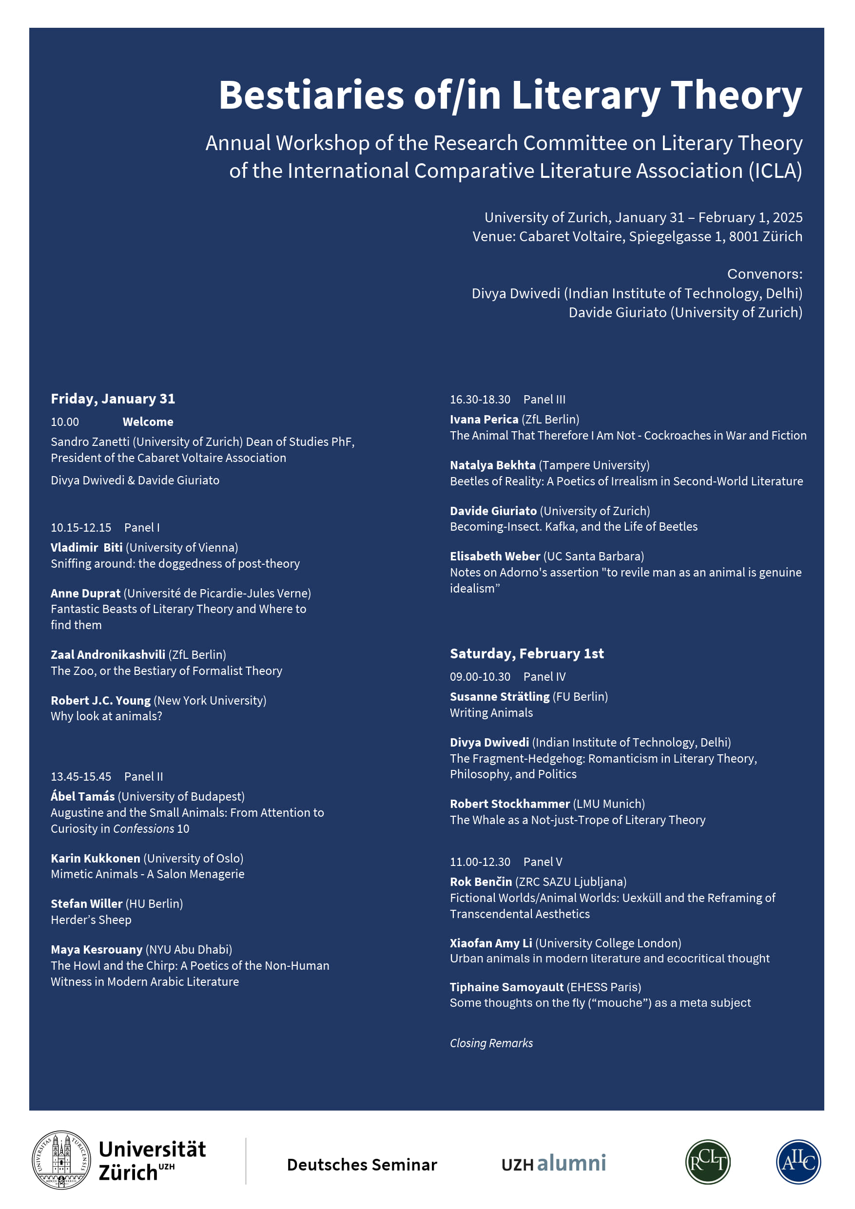 This year’s workshop of the Research Committee on Literary Theory of the International Comparative Literature Association will take place in Zurich at the end of January 2025. Co-organised by Divya Dwiwedi (Indian Institute of Technology, Delhi) and Davide Giuriato (Universität Zürich), the workshop will focus on the topic of animals, animal tropes and bestiaries – as lists, concepts, classifications – of literary theory. The workshop venue is the historic “Cabaret Voltaire”.