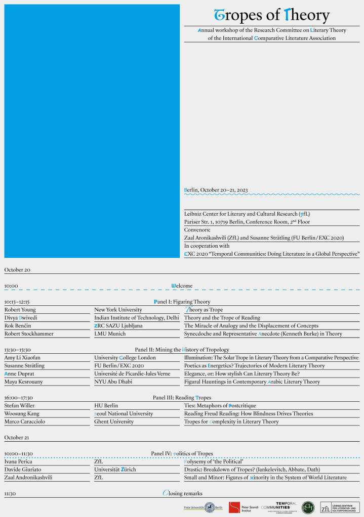 The time of the annual workshop of the Research Committee on Literary Theory of the International Comparative Literature Association is fast approaching. This year’s workshop, “Tropes of Theory”, is taking place in Berlin during 20-21 October 2023 and it is hosted by Zaal Andronikashvili (ZfL) and Susanne Strätling (FU Berlin) in cooperation with EXC 2020 “Temporal Communities. Doing Literature in a Global Perspective.”
